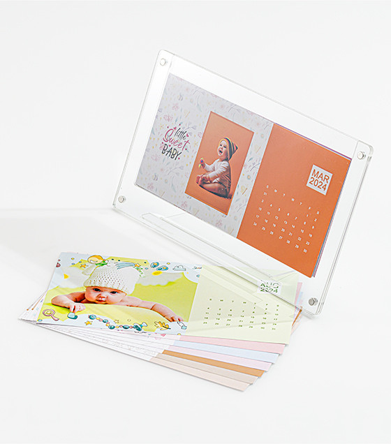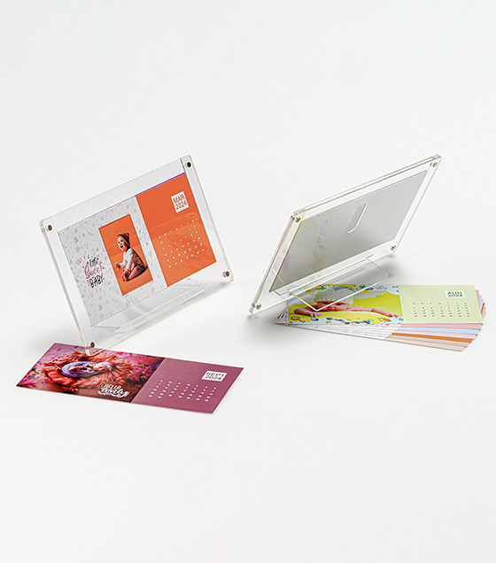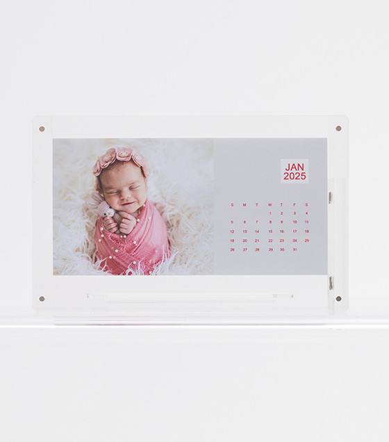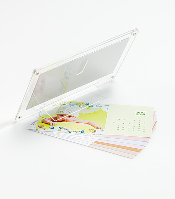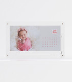 ACRYLIC TABLE TOP CALENDER, MAGNETIC JOINTS AT FRAME CORNER SO EASILY PLACE THE PRINTS, EASY CHANGE THE MONTH , NICE LOOK